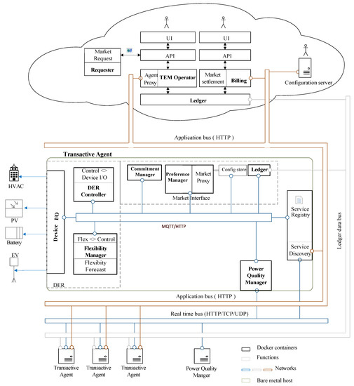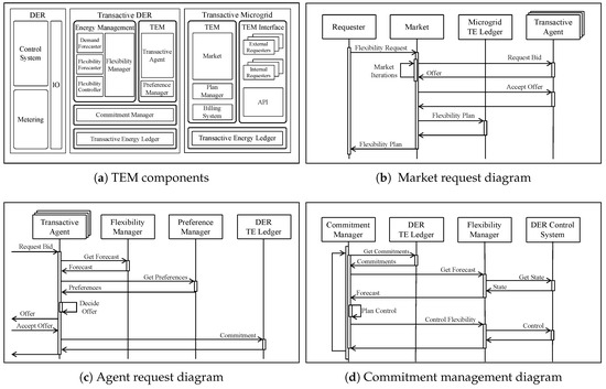 The implementation of the TEM in the Smart Energy Management layer requires a distributed software solution, which provides the functionalities needed in achieving an efficient energy management. The key components of the TEM implementation and their interaction diagrams are presented in Figure 7. Figure 7a illustrates the key components of the TEM, where a central transactive microgrid system is paired with necessary transactive DER capabilities. The separation is reflective of the design principles of delegating aggregation, planning and orchestration to a distributed market mechanism while ensuring preference privacy and decision making are retained within the control of DER.