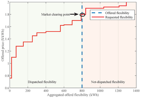 The next step is clearing, in which after receiving all offers, the market operator generates the aggregated flexibility curve. Market clearing point is the intersection of the aggregated flexibility curve and the requested flexibility line. All agents with offered prices lower than the price at the intersection win the auction. If the aggregated flexibility is less than requested flexibility, all agents with offered price lower than will be dispatched. Market clearing price is determined in settlement step, where both uniform price and pay-as-bid approaches can be applied. In the uniform pricing, price for all agents is equal to the price at the intersection, or , whichever is the lower. In the case of pay-as-bid pricing, agents will be paid on their offered prices.
