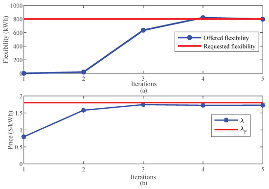 Simulation results for distributed optimization pricing are shown in Figure 10. The step size and the convergence criterion are set to 0.01 and 0.001 respectively. As shown in Figure 10a, after five iterations, the offered flexibility by agents converges to the requested flexibility, and the market rewarding price for agents is 1.72 $/kWh, which is less than as shown in Figure 10b.