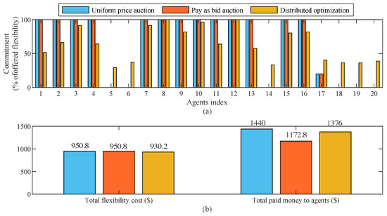 Results comparison: (a) Agents’ commitment (b) Total flexibility cost and paid money to agents.