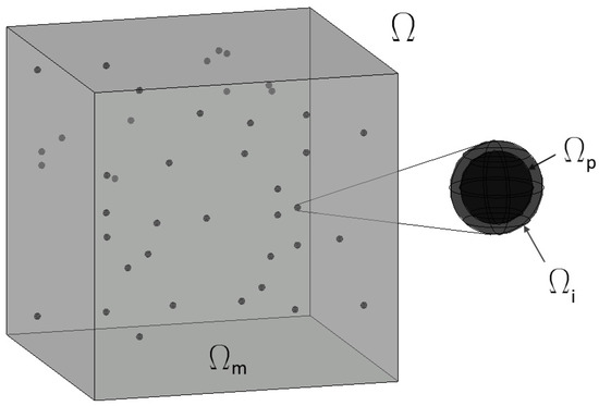 Let us introduce a continuous and heterogeneous solid body in 3D Euclidean space Ω visualized on Figure 1. It describes a particle-reinforced composite and contains three distinct phases—matrix , interphase and particles and so that