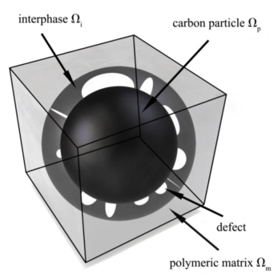 where is a thickness of hyper-elastic interphase which surrounds a particle. All material characteristics of the interphase necessary for further numerical simulation are simply calculated as volumetric average of the matrix and the defects contributions. Similarly, the effective stress of the interphase is recovered using the rule of mixtures connected to volumetric contributions of the matrix and the defects contained in