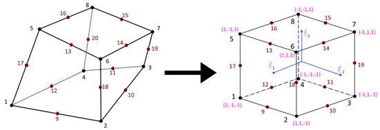 The Finite Element Method discretization of the entire RVE has been prepared with the use of 20-node three-dimensional iso-parametric finite element in three-dimensional physical space called C3D20 in ABAQUS. Let us introduce the global coordinate system and the local normalized coordinate system . The global coordinates of the i-th node after deformation we denote as respectively.