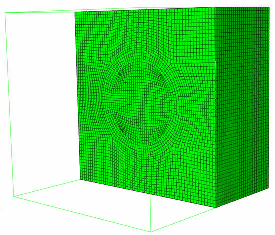 Numerical experiments are done according to the homogenization method with use of a hexagonal Representative Volume Element (RVE). This RVE has unit dimensions and consists of three phases, i.e., the polymeric matrix that occupies 90% of the RVE volume, as well as a spherical particle and the surrounding interphase, that occupy remaining 10% of the RVE, 5% each. Linear elastic particles of carbon black have initial mechanical properties equal to and . The matrix and the interphase are modeled after the laboratory tests of Laripur LPR 5020. Fitting is provided with the Arruda–Boyce hyper-elastic potential and a set of parameters of chosen from 10 different hyper-elastic models because it ensured optimal fitting to laboratory data. A surface-based tie constraint is selected for modeling a perfectly rigid contact. The interface defects volumetric ratio takes the value 0, when interphase is perfect and 1, when this interphase is composed from the defects only. Deformation energy of uniaxial stretch is computed with an implicit solver available in the FEM system ABAQUS. It is recovered from a series of cell problems, in which particle has been discretized using the hexahedral 20-noded C3D20 finite elements and the remaining phases—with the hybrid linear pressure C3D20H finite elements; the entire mesh shown in Figure 4 consists of about 150,000 finite elements. The full Newton algorithm has been applied in incremental analysis and the direct sparse multi-front equation solver has been used. The displacement of outer edges of the RVE is linearly increased in each increment of analysis. Size of increments ranges between and , while the outputs are recovered exactly 55 times during the deformation process for for each FEM realization. The model of the matrix is optimized to best represent the mean value of the uniaxial tension laboratory tests of 10 specimens. The model used in further study is chosen by minimization of the total LSM error among 10 different hyper-elastic potentials. The fitting of material parameters is done by the Least Squares Method (LSM) with equal weights.
