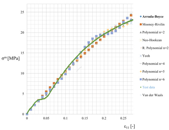 Fittings and results of laboratory tests (marked by the green points) are presented in Figure 5. They include 10 different potentials, namely the reduced (2nd order) and full polynomials (2nd, 4th, 5th and 6th order) as well as Neo–Hookean [31,32], Arruda–Boyce [33], Yeoh [34] and Mooney–Rivlin [35,36] models. Arruda–Boyce potential has been selected for further analysis with the following parameters: . It overestimates a little bit an overall value of the longitudinal stress at the strain level close to , but ensures at the same time an efficient overall estimation. As the confirmation one may notice that maximum stress coming from laboratory tests equals to and the one calculated from the Arruda–Boyce is equal to ; two other potentials ensuring relatively good fitting are the Mooney–Rivlin and the Neo–Hookean potentials.