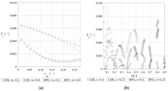 Thanks to the series of previous computer experiments with this composite [37], an overall numerical error has been limited to the values equal or smaller than 1%, see Figure 7. It is a little bit expected that this error variations resulting from strain level fluctuations form quite regular patterns and typically decreases together with an increase of the strain level. An influence of the interface defects is of the accidental nature, where the extreme values are obtained for the defects of the smallest size and this deserves more detailed FEM tests, possibly with multiscale direct modelling of these defects. Such an analysis could be provided using the NURBS technique implemented together with stochastic perturbation-based formulation of the FEM [38,39]. Quite analogous observation concerns a coincidence of the BPO and the FEM series—they coincide almost perfectly while varying the strain level, whereas uniform changes of the parameter w results in accidental coincidence.