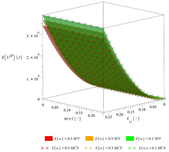 The expectations of the effective deformation energy presented in Figure 8 are practically independent of the input random dispersion , decrease together with an increase of expected value of defects volume fraction and increase together with an additional increase of . A limited influence of on is quite common for the Gaussian input parameters and was also recognized for the elastic case in [17]. An extent of decrease of between extreme is comparable to the deterministic case presented on Figure 6.