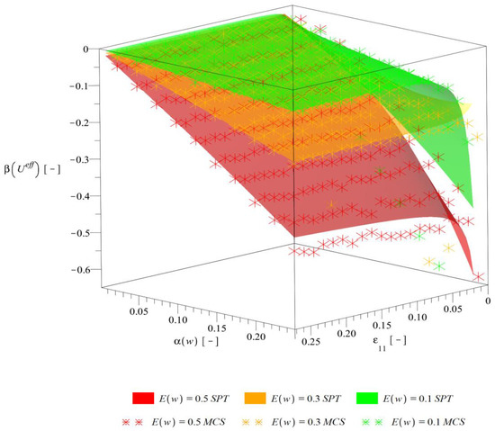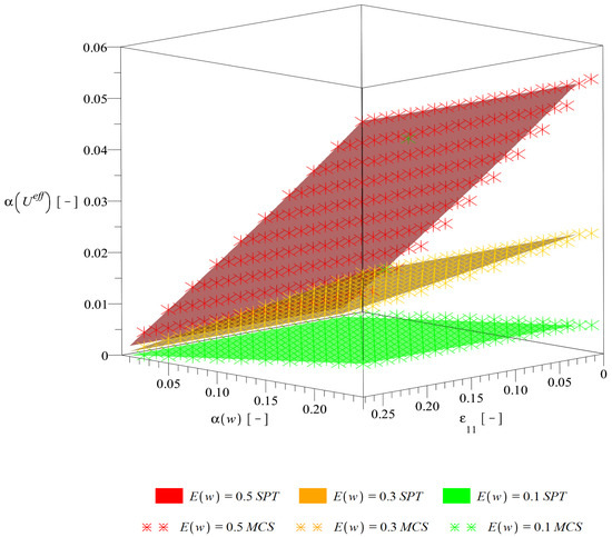 The final study includes computation of stochastic characteristics of the composite effective deformation energy relative to statistical variability of the input random parameter . These analyses are performed thanks to the common usage of the systems ABAQUS and MAPLE 2019. They are performed for fluctuating expectation of the interface defects volume fraction in range of , for its increasing coefficient of variation and for different levels of the uniaxial strain within . Approximating optimal polynomials have 5th or 6th order, whereas some numerical studies available in the literature provide linear approximation for the same phenomenon [40]. The probabilistic characteristics analyzed in this study include the expected value (Figure 8), coefficient of random dispersion (Figure 9), skewness (Figure 10) and kurtosis (Figure 11) of the resulting ; skewness is output distribution asymmetry measure and kurtosis is output distribution concentration measure. These characteristics are determined separately with two independent methods, i.e., the fourth order iterative stochastic perturbation technique (SPT) and Monte-Carlo simulation (MCS) computed for 250,000 trials for any discrete point given in these figures. Computation is based on the full bivariate polynomial. Its coefficients are optimized with use of WLSM of equal weights and optimum rank is chosen among first ten orders. Equal weighing is preferred over Dirac weighting scheme because all the computations are based on a single bivariate polynomial and the expected value of differs among realizations. It must be highlighted that computer resources required by the perturbation-based approach are much smaller than the ones necessary for Monte-Carlo simulation and time efficiency is also significantly better; the latter method is able to provide only discrete results that are marked on subsequent graphs with an asterisk.