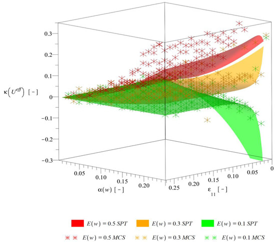 Higher order probabilistic characteristics, i.e., skewness (Figure 10) and kurtosis (Figure 11) are both increasing their magnitude together with an increase of as well as and generally decreasing in magnitude together with an increase of . Skewness remains always negative, whereas kurtosis—almost always positive. The level of the strain is important especially for low strains, for which the magnitudes of characteristics and their rate of change are the highest. Results of alternative probabilistic methods are still very good. Some differences are noticeable only for skewness with strains close to 0 and very high as well as for kurtosis with and .