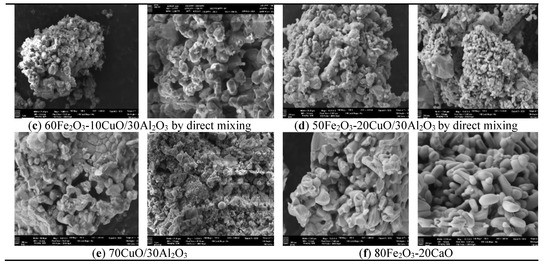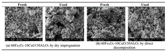 Agglomeration is one of the major challenges associated with copper-based oxygen carriers. Figure 1a–f shows the SEM images of the fresh and regenerated Cu- and Fe-Cu based oxygen carrier samples after five redox cycles in a fixed bed reactor with 10% ethylene in N2 as a fuel.