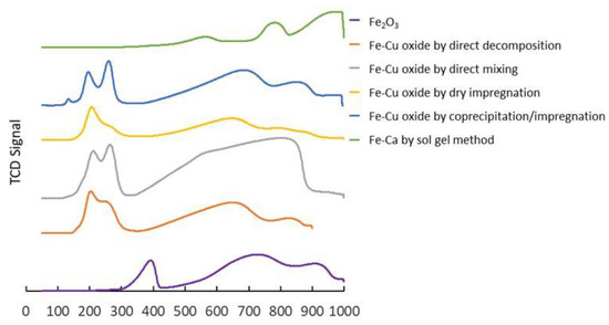 Figure 3 shows the TPR profiles of the Fe-Cu oxygen carriers prepared by various methods. As shown in Figure 3, there were three or four major reduction peaks for the Fe-Cu oxygen carriers. When a mixture of Fe2O3 and CuO with a high concentration of Fe2O3 was calcined at a temperature higher than 488 °C, two solid phases of Fe2O3-CuO and Fe2O3 possibly formed [14]. The observed three peaks therefore indicated the reduction of Fe2O3-CuO to Cu and Fe3O4, and further reduction of Fe3O4 to FeO. The fourth peak observed in one of the oxygen carriers might be caused by the further reduction of FeO to elemental Fe. The first reduction peak of the bimetallic Fe2O3-CuO oxygen carrier was observed at about 200 °C and the last peak was observed at a temperature of about 800 °C, which were much lower than first reduction peak at 400 °C and the last one at 950 °C for the reduction of an Fe2O3 oxygen carrier without a Cu promoter. Therefore, the addition of CuO as a promoter helped in lowering the reaction temperature of an Fe-based oxygen carrier. The Fe2O3-CaO oxygen carrier had much higher temperature at 600 °C for the first reduction peak and the reduction proceeded beyond 1000 °C.