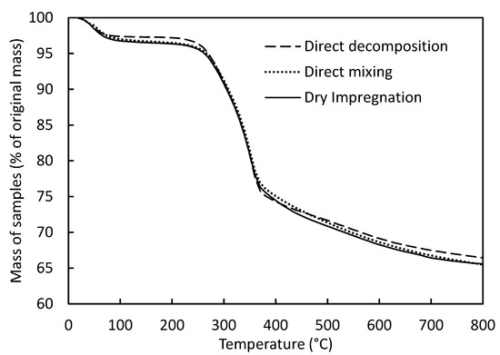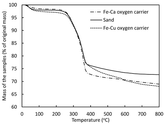 Figure 5 shows the TGA profiles of the biomass conversion using the Fe-Cu oxygen carriers with 60% Fe2O3-10% CuO supported on 30% Al2O3 prepared by different methods at a mass ratio of biomass to the oxide of 0.4:1. There was no significant difference in biomass conversion efficiency using the Fe-Cu oxygen carriers prepared by different methods. The total mass losses for all three samples at 800 °C were about 33.5% to 34.5% of the original mass of the samples. The original mass of the samples was 28.6% biomass, which was lower than the mass losses. That means that the oxygen carrier lost oxygen too during TGA analysis.