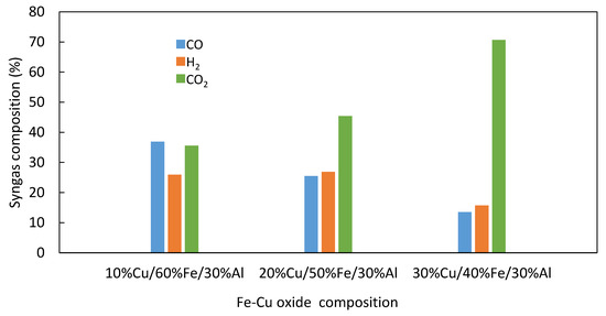 Figure 7a,b and Figure 8 show the compositions of CO, CO2 and H2 in the syngas produced during the gasification of biomass with Fe-Cu oxide (60Fe2O3-10CuO/30Al2O3) and Fe-Ca oxide (80Fe2O3-20CaO) oxygen carriers in a fixed bed reactor.