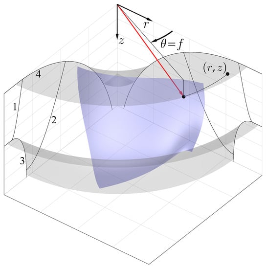 Blade camber surface example on the cylindrical coordinate system . The planes defined by illustrate the meridional projection of the blade leading edge (1) and trailing edge (2), as well as the curves that define the axisymmetric shroud (3) and hub (4) surfaces. The blade camber surface is defined by a set of coordinates , with . More generally, the B camber surfaces are defined by , with .