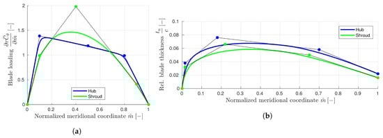 The blade loading is therefore directly proportional to the variation of the flow angular momentum along a streamline. From Euler’s equation, we have that , where E is the transferred specific energy; consequently, in the current implementation of the method the user specifies a normalized blade loading distribution that is then scaled according to the available head. Similarly, the normal blade thickness is specified relative to the average blade chord c. Example distributions of blade loading and normal blade thickness are presented in Figure 2a,b, respectively. Both of these are specified in terms of the control points of non-uniform rational basis splines (NURBS).