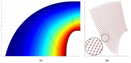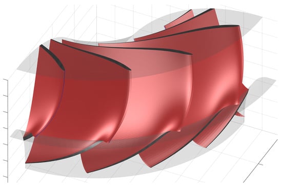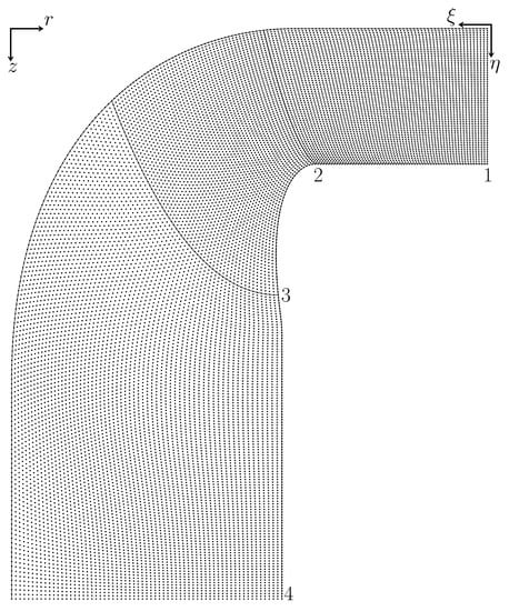 As illustrated in Figure 3, the meridional channel domain is discretized with a mesh that conforms to the blade leading and trailing edges. Finite difference approximations are used to discretize the differential operators: , , and . Second-order accurate central differences are used for interior nodes, whereas second-order one-sided approximations are used for the boundary nodes []. Equivalent finite difference approximations are used to calculate the components of the Jacobian , needed to compute the mesh metric coefficients, i.e., , , , J, , and .