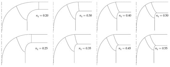 Bovet [,] proposed expressions that define the shape of the meridional channel as a function of ; the shape is then scaled according to a sizing parameter that depends on Q, and . The expressions that determine the meridional channel geometry contain 10 parameters that were fitted by Bovet to a database of Francis turbines designed by several manufacturers for a wide variety of operating conditions. In the current implementation, these parameters were updated somewhat by incorporating the more recent Francis turbine and pump-turbine designs that are reported by Henry []. Eight meridional channel geometry examples generated using the present approach are presented in Figure 4.