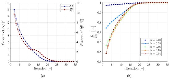 The iterative convergence behavior of the inverse design method is illustrated in Figure 6 for a representative Francis turbine case, using a mesh resolution that guarantees negligible discretization error. Figure 6a presents the -norm of the variations and between successive iterations as a function of the iteration number. The convergence is mostly monotonic, except for a small bump close to the tenth iteration after which the full periodic velocity is considered by having . About 25 iterations are required to achieve a converged solution; a faster convergence is possible for this particular case by setting the relaxation factor , although the more conservative adaptive approach is preferred in order to ensure convergence for all cases. Figure 6b evidences the monotonic convergence of the camber surface angle f at five points; the results are normalized by the respective angle value at the last iteration, . As expected, the points closer to the leading edge () change significantly less than the points further down, in relation to their initialization value , given that the camber surface angle at the leading edge is fixed by the stacking condition selected.