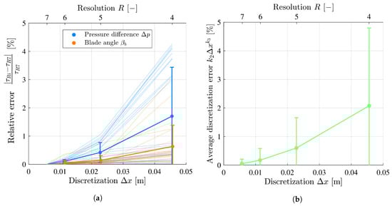 Figure 7a presents the relative error for with respect to the corresponding values computed on the finest grid, . The relative error for each of the 25 points analyzed is illustrated by thin lines, whereas the bold lines represent the average relative error, with error bars computed from the standard deviation. A clear convergence of the solution is evidenced, with the relative error monotonically decreasing with the mesh resolution. For the coarsest mesh the average relative error for the pressure difference is about , whereas for the blade angle it is less than .