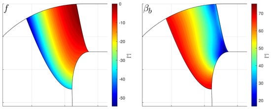 The fluid velocity is decomposed into an axisymmetric mean velocity and a tangentially-periodic velocity . The blade camber surface, defined by the wrap angle , is updated iteratively, together with the flow field, until convergence is achieved. To begin the iterative procedure, an initial guess of f is computed based on the distribution, together with the assumption of uniform meridional velocity , itself computed from the discharge. As seen in Figure 2a, the Kutta–Joukowski condition is satisfied by setting at the trailing edge, such that the pressure difference there is null, whereas the well-aligned flow condition is satisfied by setting at the leading edge, meaning that the incidence angle is defined to be zero.