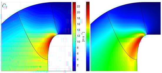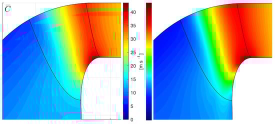 First the velocity fields are used to qualitatively validate the output of the inverse design method implementation. On the following figures, even though the color scale is not identical in matlab and CFX, the same variable range is enforced and both color bars are presented. To further aid in the assessment of the results, the meridional projections of the blade leading and trailing edges, as well as of the hub and shroud, are superimposed on the CFX flow fields. There is a significant agreement for the mean flow velocity magnitude , as evidenced in Figure 10. Both the main flow features and the velocity magnitude are well approximated by the present method, compared to the fully-3D Navier–Stokes solution, in spite of the underlying inviscid and axisymmetric mean flow assumptions. The same can be said about the radial and axial mean velocity components, presented in Figure 11 and Figure 12, respectively.