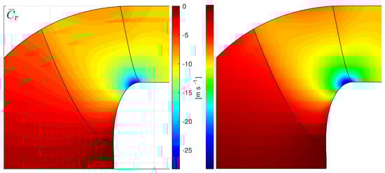 Mean radial velocity computed using the inverse design method implementation (left) and the ANSYS CFX Navier–Stokes solver (right).
