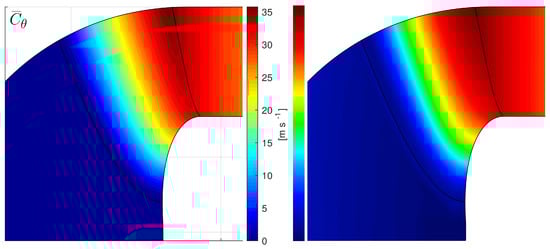 Mean tangential velocity computed using the inverse design method implementation (left) and the ANSYS CFX Navier–Stokes solver (right).