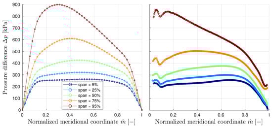 The pressure difference across the blade is presented in Figure 14. As revealed by Equation (13), the pressure difference is proportional to , i.e., proportional to the blade loading, and to the meridional projection of the relative flow velocity, which is greatest towards the shroud. Both of these factors are encompassed in the pressure difference distributions obtained.