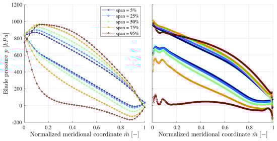 A comparison of the pressure profiles over the blade is presented in Figure 15. Whereas in the Navier–Stokes solver the pressure is actually computed on each of the blades surfaces, in the current implementation Equation (14) is used to estimate the average meridional pressure , and then the computed pressure difference across the blade is symmetrically superimposed: .