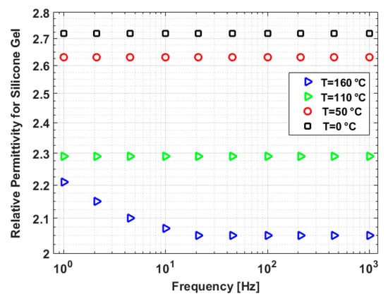Simulations are performed for a base case ({22 °C, 50 Hz}) and four case studies (Case 1: {110 °C, 450 Hz}, Case 2: {110 °C, 1000 Hz}, Case 3: {160 °C, 450 Hz} and Case 4: {160 °C, 1000 Hz}). From Figure 1, for the base case and Cases 1–4 are 2.72, 2.29, 2.29, 2.05, and 2.05, respectively. As seen from Figure 1, is frequency-independent for the 50-1000 Hz range, but it decreases with temperature. From Figure 2, for the base case and Cases 1-4 are 1.1 × 10−14, 3.9 × 10−13, 3.9 × 10−13, 8.8 × 10−11, and 7.4 × 10−11 S/m, respectively. For 110 °C, was measured up to 100 Hz (3.9 × 10−13 S/m) in [43] as shown in Figure 2. We assume that for 450 and 1000 Hz is also 3.9 × 10−13 S/m. For 22 °C, was reported up to 4.5 Hz (1.1 × 10−14 S/m) in [43] and we assume that for 50, 450 and 1000 Hz, it does not almost change and is 1.1 × 10−14 S/m. From Figure 2, it can be seen that is almost frequency-independent, thus the assumptions above are acceptable.