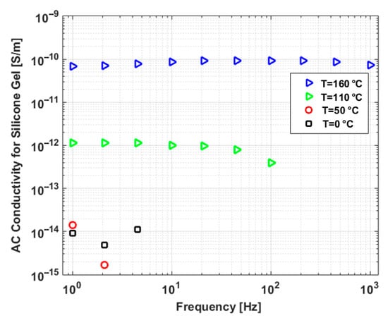 AC conductivity of silicone gel versus frequency at several temperatures between 20 and 160 °C, reproduced from [43].
