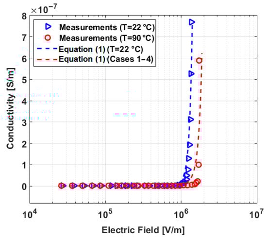 More recently, a new nonlinear field grading material based on ZnO microvaristors has become available and, for the first time, its feasibility for electric field reduction in power modules was studied through simulations [22]. In [45], electrical and thermal data of ZnO microvaristors are presented, where Figure 3 (reproduced from measuring data in [45]) shows the effect of temperature on the conductivity of a silicone compound with ca. 35 vol% ZnO microvaristor filler at 22 and 90 °C. As argued in [45], the combined actions of the thermally activated transport of ZnO microvaristor fillers and the thermal expansion of the silicon rubber matrix result in a rather temperature-independent conductivity.