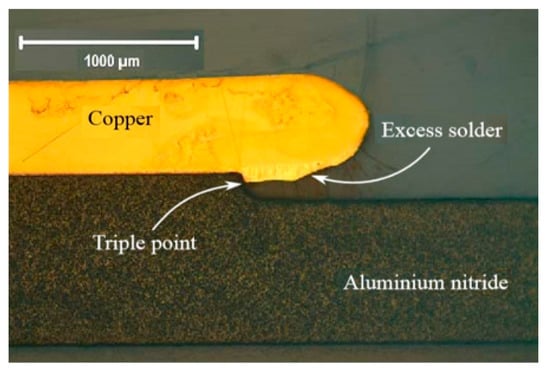 (a) Schematic cross-section of a metalized aluminum nitride (AlN) substrate, (b) Protrusion with extremely sharp edges of brazing below the metallization.