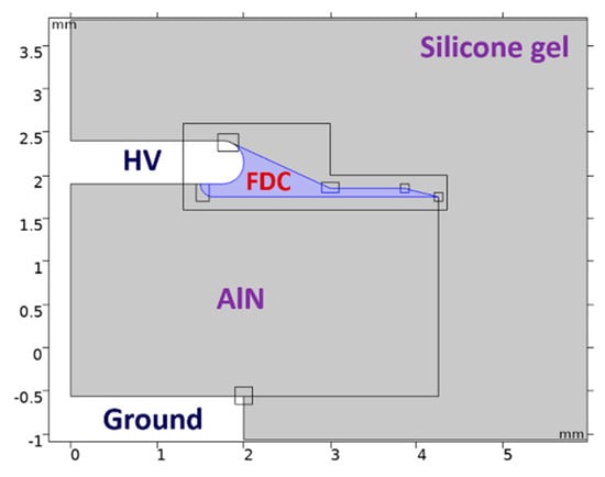 Despite the noticeable electric field reduction within the ceramic substrate through the protruding substrate, a negligible improvement in the electric field distribution within the silicone gel is yielded. To address the enhanced local electric stress within the silicone gel, a nonlinear FDC layer as shown in Figure 6 is applied to high-stressed regions, including the high voltage metallization edges and the rims of the ceramic substrate close to the high voltage zone. Nonlinear FDC materials influence the electric field distribution in the module by increasing the leakage current within the module when the electric stress exceeds a threshold value.