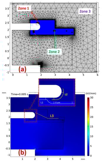 The accuracy of the simulation results in finite element methods (FEMs) is highly dependent on the mesh resolution considered. The higher the density of the mesh elements, the more accurate and reliable the simulation results. However, using an extremely high-resolution meshing for the whole geometry results in a need for lots of memory resources and time-consuming simulations. To address the aforementioned issue, three zones (as shown in Figure 7a) with different mesh sizes were defined. An extremely dense meshing with a maximum element size of 4 µm was used for zone 1, which incorporated all sharp edges. The maximum mesh element sizes of 10 and 400 µm were also used for zones 2 and 3, respectively.