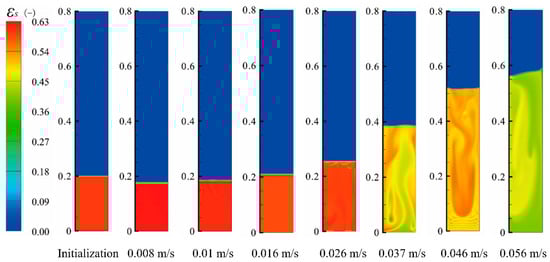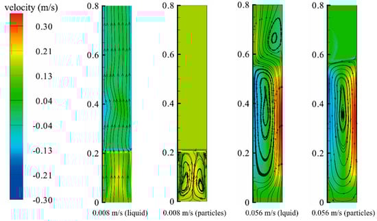 In coal processing, a large amount of narrow sized particles are fluidized in counter water flow to form the teeter bed. Therefore, water velocity is a key factor affecting the bed characteristics and also an important operating parameter for coal separation. In this section, the simplification of mono size particles was assumed to form a self-generating medium bed. Figure 2 shows the change of bed expansion with fluidization velocity varied from 0.008 to 0.056 m/s. It can be seen that the bed was fluidized at all water velocity. For the lower water velocity of 0.008 m/s and 0.01 m/s, the bed height was lower than the initial state value, and corresponding volume fraction was larger than the initial value of 0.55. As the water velocity increases, the bed expansion gradually increases and at the water velocity of 0.016 m/s, the bed height has exceeded the initial state. When water velocities in the range of 0.008–0.160 m/s, the consistent color in the figure revealed that the local volume fraction of particles was uniform along the whole column. When the water velocity increases further, especially in higher value of 0.056 m/s, the uniformity of the bed deteriorates because of the strong turbulence caused by many eddies. This phenomenon can also be illustrated from the flow patterns of the bed in Figure 3. The liquid flow along the column was stable and very regular at the relative lower water velocity, and the particle flows was small and symmetric which was helpful to achieve the homogeneous regime. However, at high water velocity, the regularity of the flow state was disturbed, for large circulation flows of liquid and particles increases the turbulence intensity resulting in heterogeneous regime in the bed.