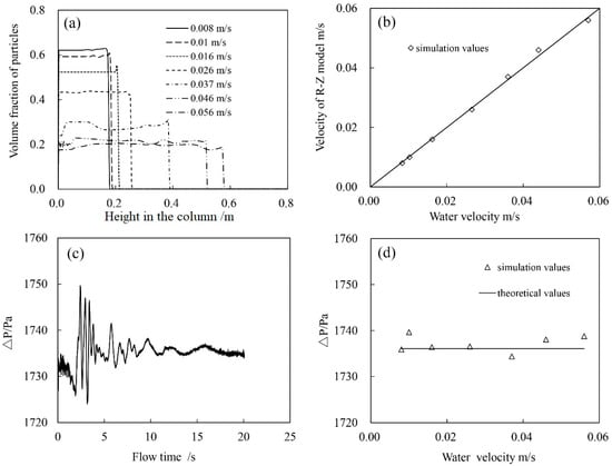 Changes of the bed characteristics during bed expansion: (a) the effect of water velocity on volume fraction of particles; (b) comparison of predicted velocity with that of R-Z model; (c) pressure drop changing with simulation time at water velocity of 0.046 m/s; (d) Comparison of pressure drop with theoretical value from Equation (14).