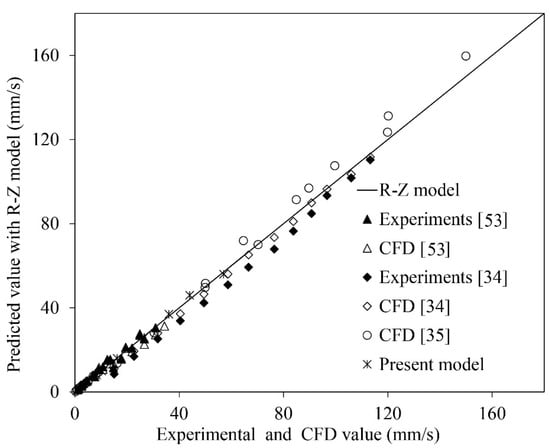 Figure 4 shows the changes in specific values of the bed characteristics during bed expansion. The volume fraction of particles along the axial direction of the column during bed expansion can be seen in Figure 4a. It shows that the volume fraction of particles decreases with the increase of water velocity and from the waved curves, we can see that the dispersion of particles was not uniform at higher water velocity. Finally, the values of the volume fraction of particles at each water velocity were calculated by averaging values in all grid nodes along the central axial direction (The intersection of the horizontal and vertical axes was located at the half width of the bottom of the column. The central axis was a vertical line passing the intersection). The corresponding volume fractions for each water velocity of 0.008 m/s, 0.01 m/s, 0.016 m/s, 0.026 m/s, 0.037 m/s, 0.046 m/s and 0.056 m/s were 0.615, 0.587, 0.518, 0.430, 0.279, 0.214 and 0.194. Thus, we can calculate the velocity of particles according to the Richardson and Zaki (R-Z) model [22] and compare model data with present water velocity to examine the simulation results. The R-Z model was intensively used in several publications to compare their study results with model values. The predicted values in the present model were also compared with parts of experimental and simulated data of the publication [34,35,53], which is summarized in Figure 5. It can see from Figure 5 that the present values exhibit good consistence with experimental data of the literature and R-Z model. Thus, it was can be concluded that Figure 5 show a good illustration for the rationality of present simulated values. In order to have a clear observation, Figure 4b plots again to show the consistency of the simulated value and R-Z model. The changes of bed drop (ΔP) with flow time at water velocity of 0.046 m/s appears in Figure 4c. It was shown that the pressure drop fluctuates at the beginning and stabilized in 1730–1740 Pa with increase of flow time. The abnormal pressure drop occurred at the beginning may be caused by the local channel flow. Figure 4d shows the pressure drop changes with water velocity. It can be observed that the bed drop hardly varies with water velocity and the simulated value was mostly around the theoretical value of 1736.06 Pa in Figure 4d calculated by the Equation (14). This phenomenon proves the validity of the simulation results again.