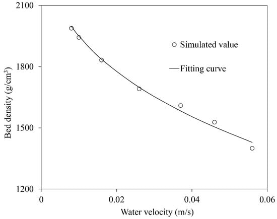 Bed density is a reflection of particle density, solids volume fraction and liquid velocity. As shown in Figure 6, bed density reduces as the increase of water velocity and they show a good power relationship, which can be quantified by the fitting Equation (15). In real separation cases, when the bed density reduces resulting from the increase in water velocity, most of light particles were directly dragged to the overflow subjected to the hydraulic force without effective separation. When the water velocity was lower, the bed density increases as the solid phase becomes dense inside bed. At the same time the viscosity of the suspension also increased as a large number of particles were crowded together. Thus, in a system with high concentration particles, the properties of the fluidized suspension was close to that of heavy liquid, in which particles were separated according to density.