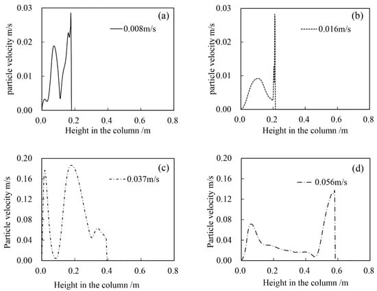 Fluidized particles move differently with water velocity during the whole bed expansion process. Figure 7 plots the particle velocity along the height of the bed at different water velocity. The overall trend was that the particle velocity increases as the water velocity increases. At lower water velocity, the bed reaches good homogeneity which can be seen from former analysis and the velocity distribution of particles was also relatively uniform. The higher water velocity brings degradation for the uniformity of the particle velocity distribution. The result was consistent with former analysis of the impact of water velocity on the volume fraction of particles in the bed.