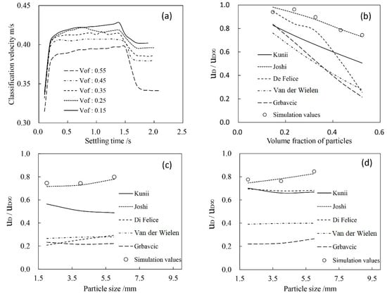 The teeter bed above provided a hindering settling environment for other particles (here, called foreign particles) which have different properties (size or density) with the fluidized particles. Foreign particles move resisting forces from the bed to the overflow or underflow and achieve the separation. In this section, several foreign particles were introduced to the teetered bed to study their motion behavior. The results are shown in Figure 8a that a 4 mm foreign particle with density of 2607 kg/m3 was introduced from the top of the column. We can see that the particle has gone through four stages: accelerating, reaching balance in water, deceleration and reaching equilibrium in the bed. The particle velocity decreased significantly due to the resisting force from the bed; it decreased as the volume fraction of particles increased. For a clear comparison of simulated slip velocity with that of literature models, the particle slip velocity was normalized by dividing the free settling velocity. Figure 8b compares the normalized slip velocity of foreign particle of 4 mm size and density of 2607 kg/m3 with the literature values. What needs to be explained: the free settling velocity of all particles involved in these models were the simulated data. For 2-mm, 4-mm and 6-mm glass particles, the simulated free settling velocities were 0.282 m/s, 0.445 m/s, 0.565 m/s, and for 2 mm, 4 mm, 6 mm steel particles, the values were 0.644 m/s, 0.969 m/s, 1.173 m/s. The deviation of simulated free settling velocity of particles were within 8% compared with Zigrang and Sylvester model [54]. In Figure 8b, it was observed that the classification velocity of the particle decreased with the increase of volume fraction of particles. The phenomenon is exhibited in both simulated values and literature models. It implies that the resisting force acting on foreign particles increased as the volume fraction of particles in bed increased. Moreover, the normalized slip velocity of the 4 mm particle through the bed was close to that of Joshi model.