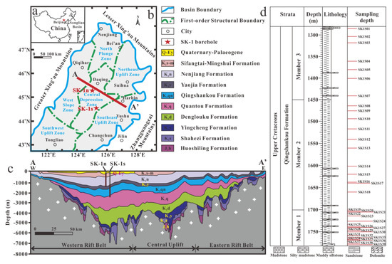 - Wan, X.Q.; Zhao, J.; Scott, R.W.; Wang, P.J.; Feng, Z.H.; Huang, Q.H.; Xi, D.P. Late Cretaceous stratigraphy, Songliao Basin, NE China: SK1 cores. Palaeogeogr. Palaeoclimatol. Palaeoecol. 2013, 385, 31–43. [Google Scholar] [CrossRef]