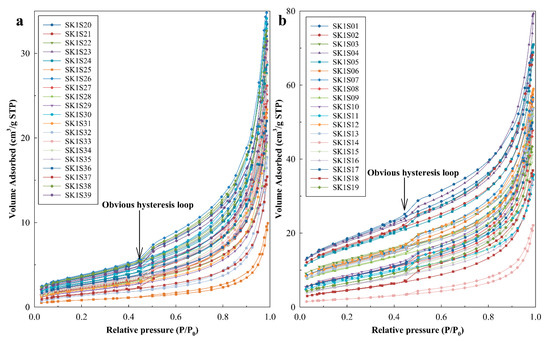 - The nitrogen adsorption/desorption isotherms of Qingshankou Formation shales are of Type IV, which represent mesoporous nature. According to the slope of isotherms measured by ΔVG/Δ(P/P0), most of the samples might have macropores or fractures. The hysteresis patterns are H3 and combination of H3-H4, which demonstrate these shales have slit-shaped pores produced by aggregates of plate-like particles and some narrow slit-shaped pores. Compared with shales in K2qn2,3, shales in K2qn1 have larger average pore diameter, much smaller BET SSA, and fewer micropores.