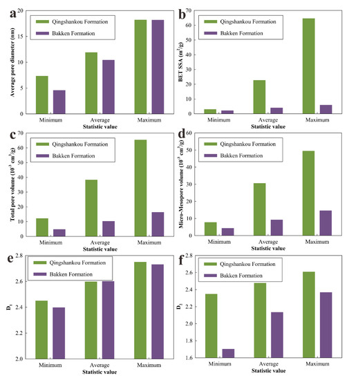 - The lacustrine Qingshankou Formation shales and the marine Bakken Formation shales have similar pore types, but they have different pore shapes. Average pore diameter, BET SSA, total pore volume, and micro-mesopore volume in the Qingshankou Formation are larger than those in the Bakken Formation. These two formations have similar complexity of pore structure, but Qingshankou Formation shales have much rougher pore surface than Bakken Formation shales.