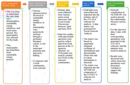 To address our research question, we applied a mixed-methods approach [44]. The research dealt with “who is involved and how” with regards to sustainable energy development. Hence, the mixed-method approach was suitable because it combines both quantitative and qualitative approaches, which allowed for analyzing actors’ involvement using social network analysis (quantitative) and in-depth analysis, with a qualitative description of how various actors were involved in the planning and implementation of sustainable energy initiatives at the local level. Figure 1 displays the major methodological steps.