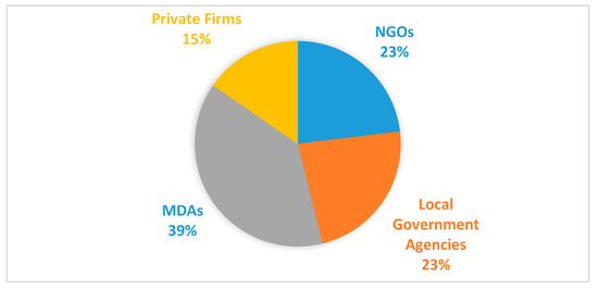 The principal actors identified in the sustainable energy sector in the Wa municipality are local government agencies, NGOs, Ministries, Departments and Agencies (MDAs), and private sector organizations. The ensuing sub-section discusses the activities of the various actors in detail. The study revealed 13 main actors in sustainable energy initiatives in the Wa municipality (see Figure 2). Two beneficiary communities of sustainable energy projects were also included. Hence, a total of 15 actors were analyzed.