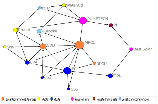 Using the closeness centrality scores, it can be deduced from Table 2 that the MPCU, CDD, EC, and PUMPTECH are closer to all of the other actors in the network than the rest. According to Hansen et al. [50], a low closeness centrality score means that an actor is directly connected to or just a step away from most of the other actors in the network. On the other hand, a higher closeness centrality score implies that an actor is farther away from all of the other actors in the network.