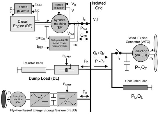The first part of this article presents the modelling of the WDPS shown in Figure 1, which can work in DO and WD modes. In addition to a DG, WTG and consumer load, the WDPS includes a dump load (DL) and a flywheel ESS (FESS). The second part and main goal of this article aims to present solutions for the WD mode of the WDPS of Figure 1 in the case where the WTG produced power PT exceeds the load consumption PL, a situation that makes the WDPS unstable. The WTG power excess situation (PT > PL) is simulated in WD mode in three cases, namely DL and FESS-off (DL and FESS are turned off), only-DL (DL actuates but FESS is turned off) and only-FESS (FESS actuates but DL is turned off). In the DL and FESS-off simulation case, it is shown that to prevent the isolated power system collapse that the WTG power excess provokes, the solution is to trip the WTG circuit breaker (IT in Figure 1). In both the only-DL and only-FESS simulation cases, it is shown how the DL/FESS are commanded to consume controlled power, avoiding the WTG circuit breaker trip necessary in the DL and FESS-off case so that the WDPS absolute stability is increased. A previous paper [] deals with simulations in WO mode of a system that comprises a WTG, a grid forming SM, load and a FESS. Ref [] does not include a diesel engine, therefore this article’s isolated power system architecture is different. In a previous paper [], the simulated WDPS includes a FESS, but no DL is considered. Furthermore, the WTG power levels in [] are below the load consumption (PT < PL) in all the simulations, so [] does not deal with the WTG power excess situation. In addition, [] focuses on the control of the FESS power converter. Previous papers [] and [] use a battery ESS instead of a flywheel ESS, so the used power converter and ESS variables shown in the simulations are different. Additionally, [] and [] do not use the DL. The WD mode simulations in [] do not consider the WTG power excess situation dealt in this paper. Ref. [] deals with a high penetration WDPS and its main simulations are in WO mode.