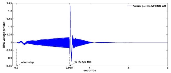 Root Mean Square (RMS) Voltage per unit for the DL and FESS-off case.