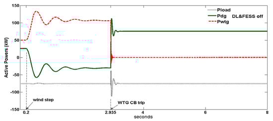 Wind turbine generator (WTG), diesel generator (DG) and load active powers (kW) for the DL and FESS-off case.